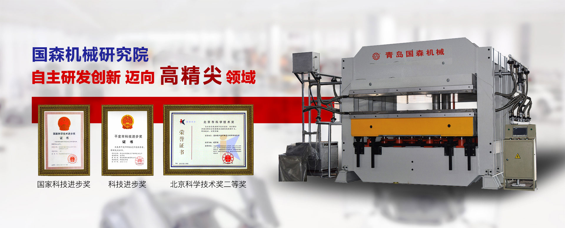ABOUT US 走进国森 青岛国森机械有限公司是国家高新技术企业、青岛市创新型企业,ISO9001质量管理体系认证企业,专业研发制造人造板机械设备,技术力量雄厚,加工设备精良,产品覆盖冷链、轨道交通、生物质速生材应用、航空、家具、建材等多个行业领域。